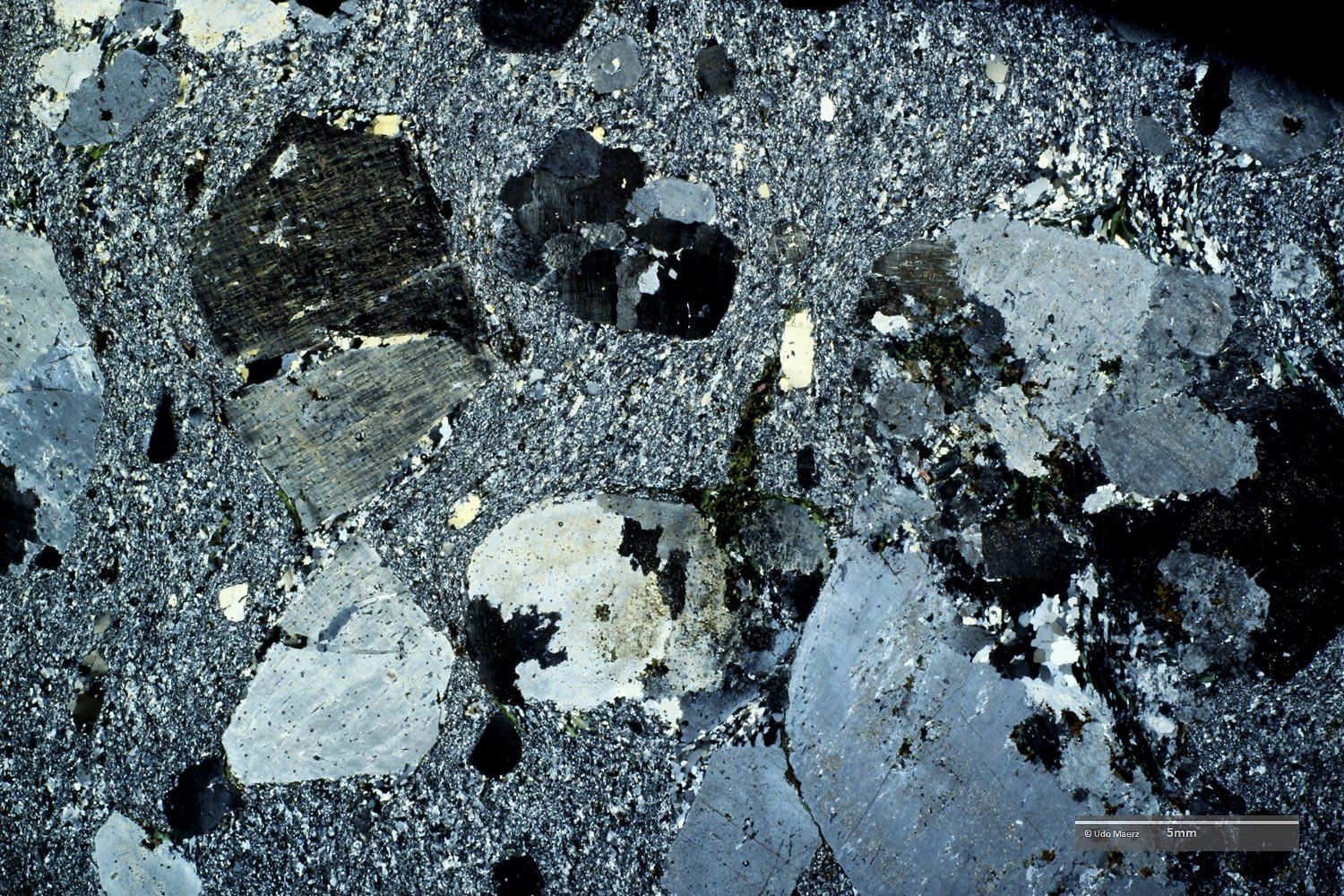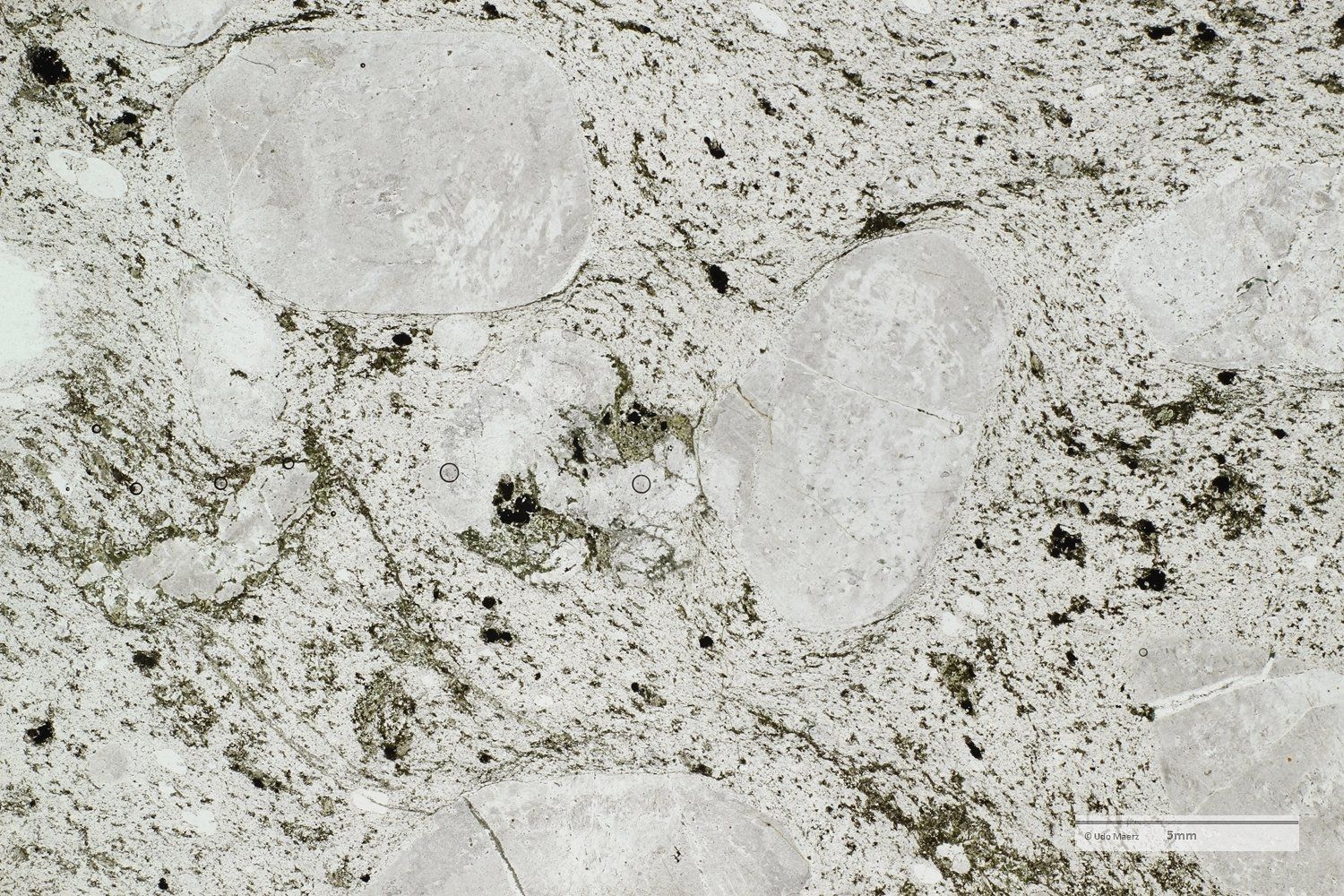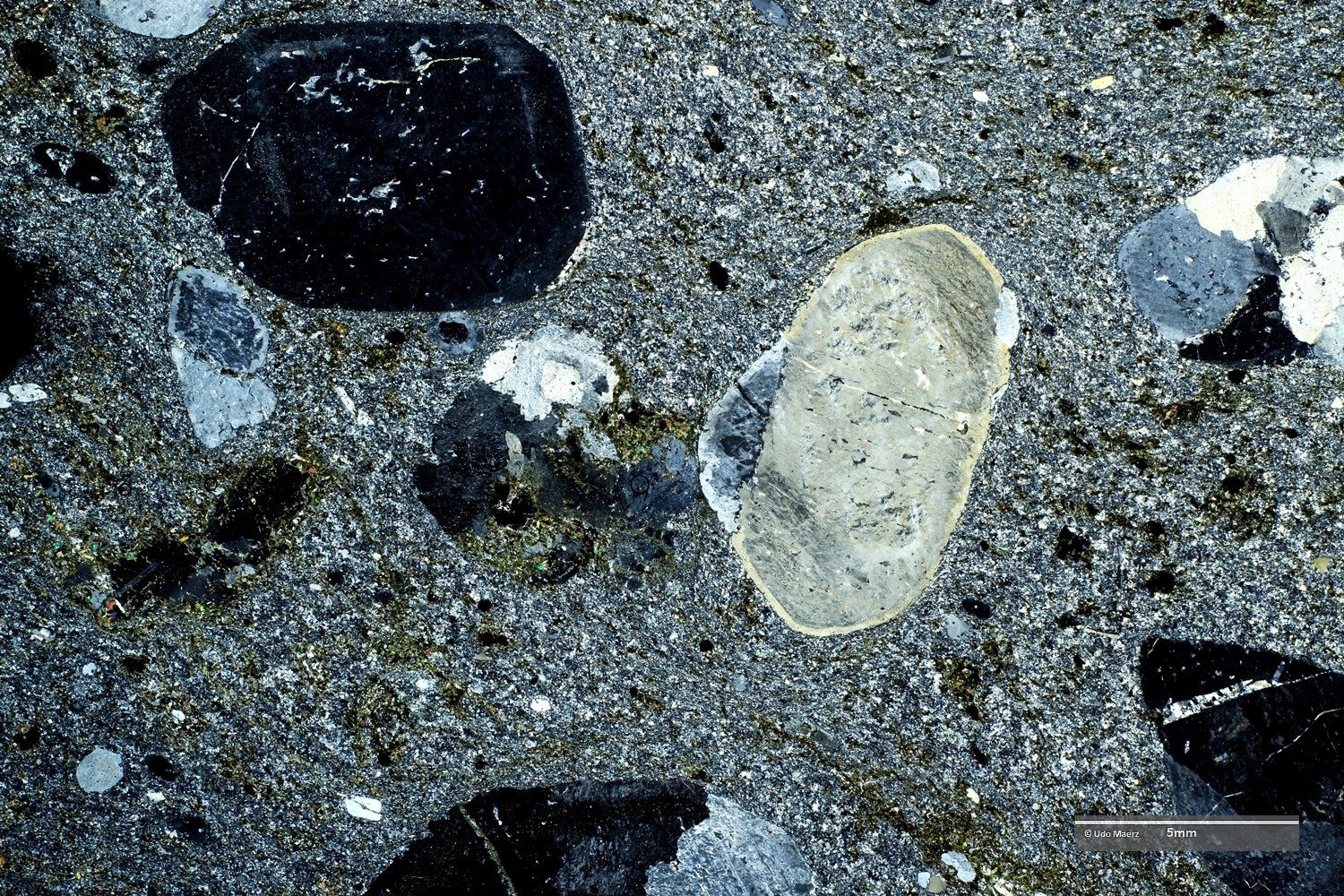 In den Makro-Aufnahmen erkennt man die hervorragend gerundeten Einsprenglinge, die als einzelne Kristallbruchstücke (großer dunkler Bereich im XPL-Bild oben) und als Gesteinsfragmente (im XPL-Bild am rechten Bildrand oben und unten mit ausgeheiltem Kluftriss) auftreten. Im LPL-Bild erkennt man in der feinen Grundmasse eine leichte Fältelung, die durch grünliche, sekundär gebildete Minerale besonders betont wird.