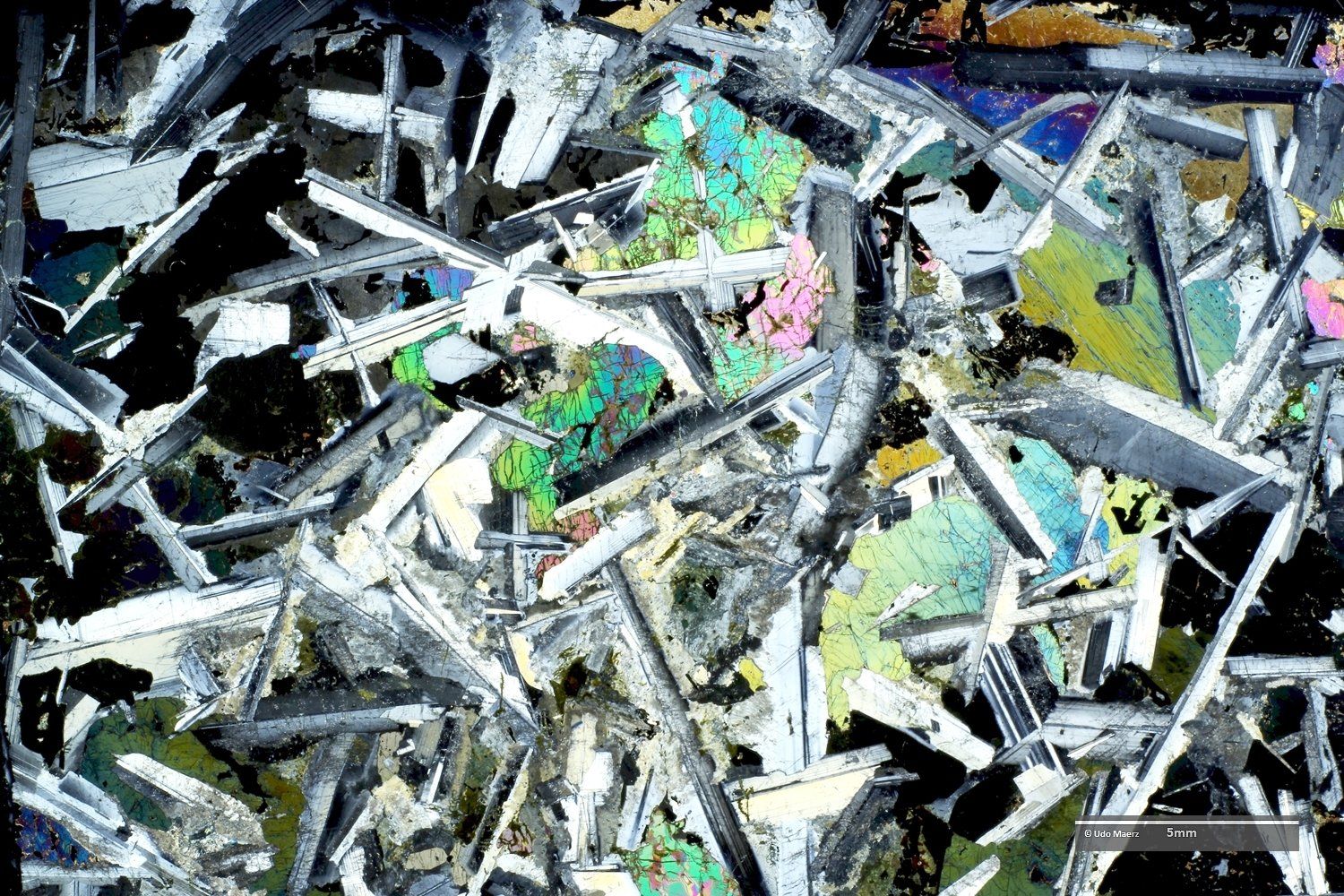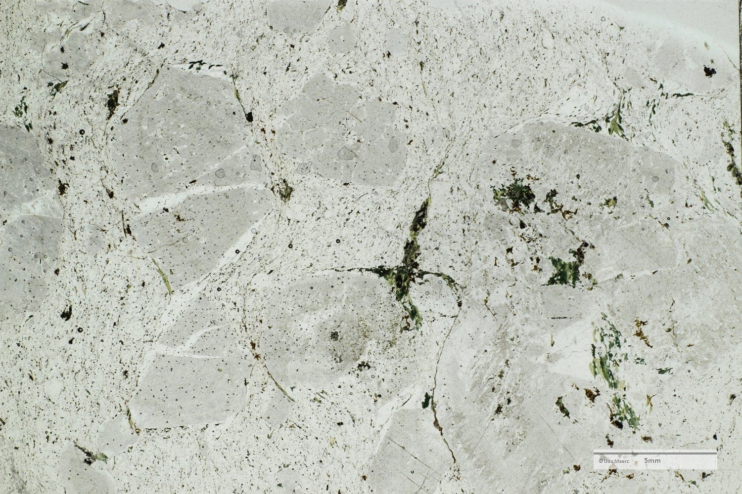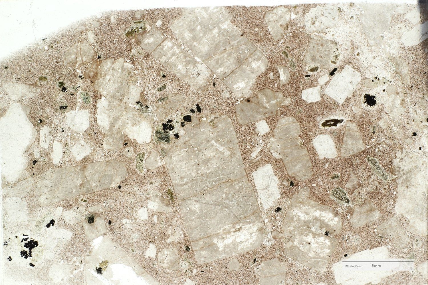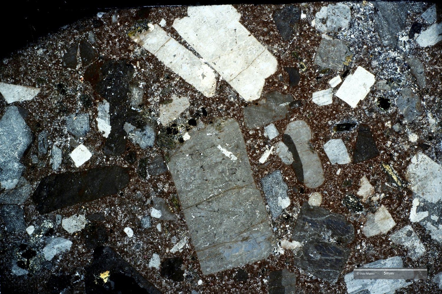 In den Makro-Aufnahmen erkennt man die hervorragend gerundeten Einsprenglinge, die als einzelne Kristallbruchstücke (großer dunkler Bereich im XPL-Bild oben) und als Gesteinsfragmente (im XPL-Bild am rechten Bildrand oben und unten mit ausgeheiltem Kluftriss) auftreten. Im LPL-Bild erkennt man in der feinen Grundmasse eine leichte Fältelung, die durch grünliche, sekundär gebildete Minerale besonders betont wird.
