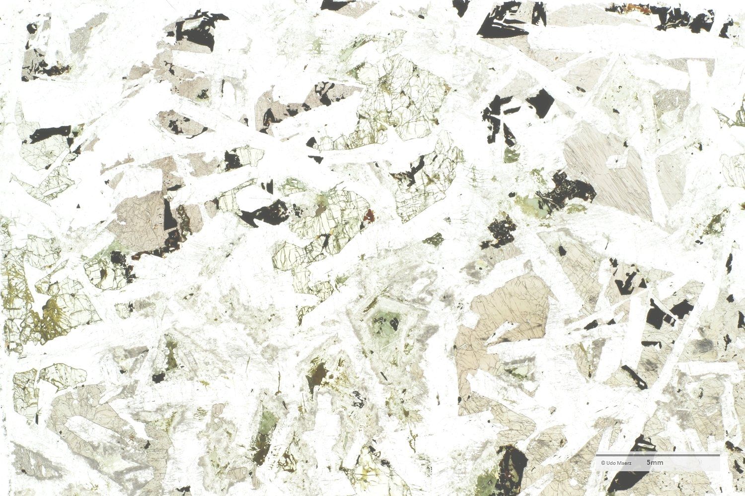 Die folgenden Bilder zeigen die Makroaufnahmen eines Dünnschliffs dieses Gesteins, links im normal linear polarisiertem Licht (LPL) und rechts mit gekreuzten Polarisatoren (XPL).